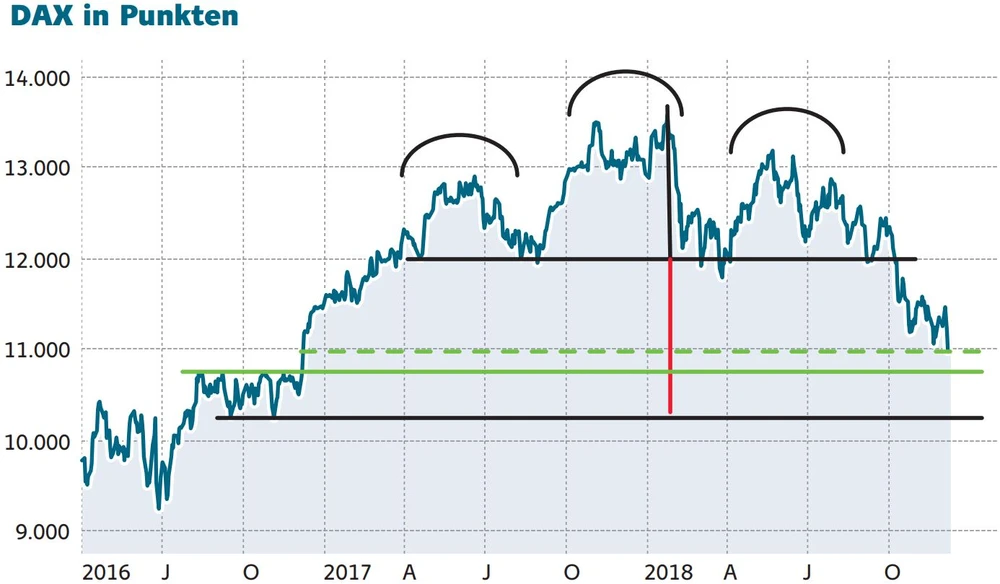 Sollte der DAX auf dem aktuellen Niveau schließen, wird wohl die Kurslücke, die nach der Wahl Trumps zum US-Präsidenten aufgerissen wurde, in den nächsten Tagen geschlossen. Im Worst Case ist das noch nicht das Ende der Abwärtsbewegung. Aus der Schulter-Kopf-Schulter-Formation, die der DAX zwischen und ausgebildet hatte, lässt sich ein Kursziel zwischen 10.400 und 10.450 ableiten.