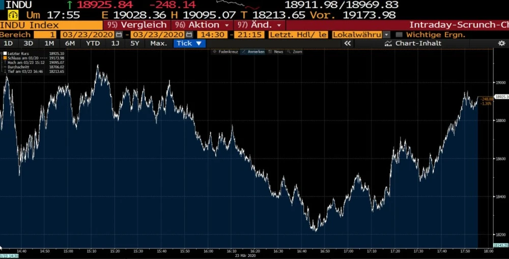 Dass der Aktienmarkt nichts für schwache Nerven ist, ist nichts Neues. Am Mittag noch herrschte Zuversicht, dass die neuen Maßnahmen der Fed die Märkte stabilisieren. Am Nachmittag folgte aber sehr schnell wieder Ernüchterung – der Dow drohte unter 18.000 zu fallen. Mittlerweile geht es erneut aufwärts. Die 19.000 ist in Reichweite.
