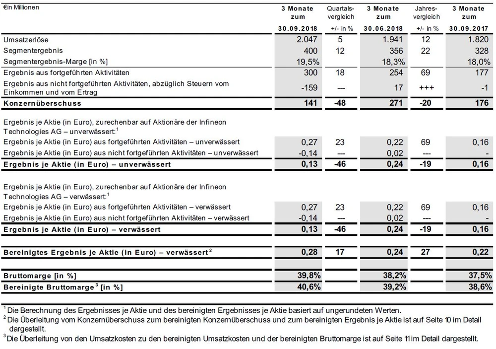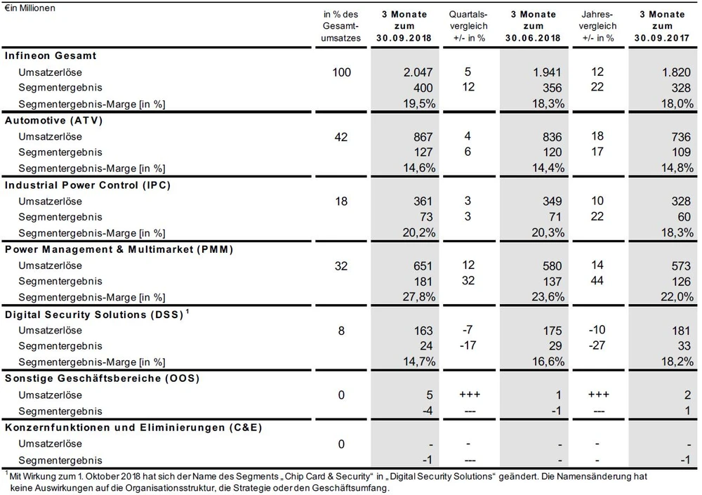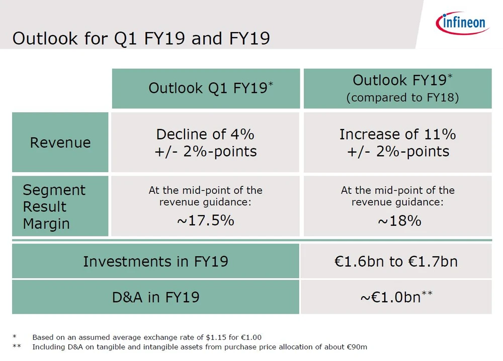 Der deutsche Chip-Riese Infineon hat überzeugende Zahlen für das vierte Quartal präsentiert. Auch der Ausblick auf das Geschäftsjahr 2019 fiel gut aus. Die Aktie legt vor Xetra-Start rund drei Prozent zu, nachdem Infineon die Erwartungen der Analysten in sämtlichen Belangen schlagen konnte.