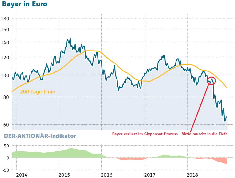 Bayer hat sich mit der milliardenschweren Übernahme des Hochrisiko-Konkurrenten deutlich verhoben und hat nun die Folgen des Glyphosat-Prozesses an der Backe. Zuletzt hatte ein US-Gericht einem krebskranken Amerikaner, der jahrelang mit Monsantos Unkrautvernichter gearbeitet hat, 78 Millionen Dollar an Schadenersatz zugesprochen. Laut Bayer summiert sich die Anzahl möglicher Kläger auf mehr als 9.000. Ein Fass ohne Boden.
