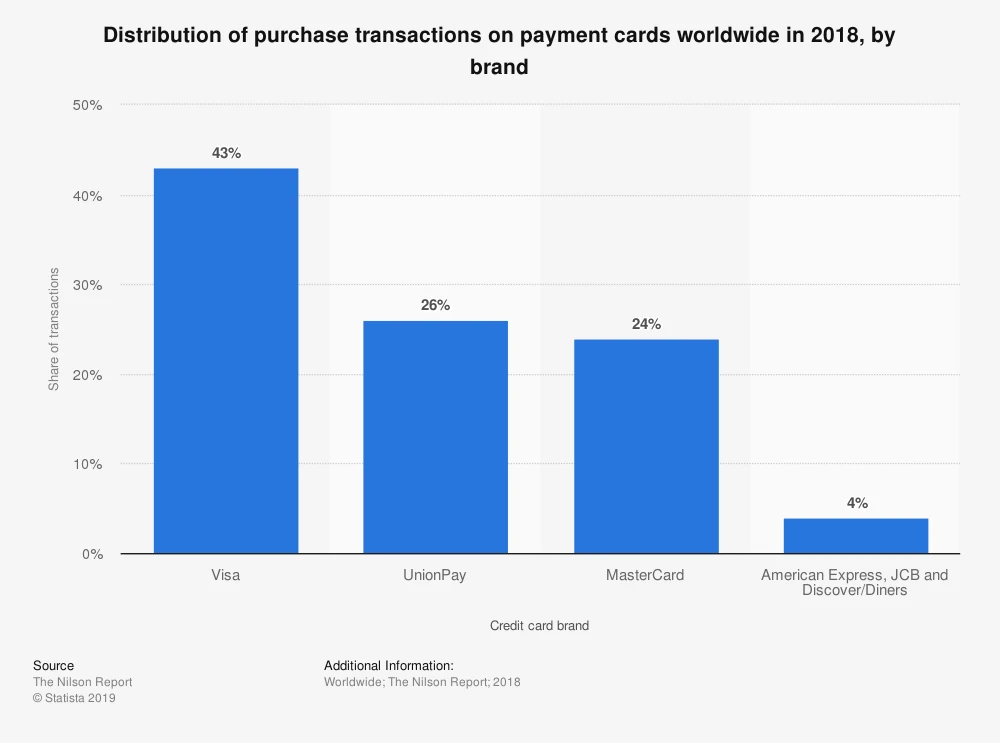 Gemessen an der Zahl der weltweiten Transaktionen hat sich UnionPay laut Statista im vergangenen Jahr auf Platz 2 eingereiht – hinter Visa und vor Mastercard.