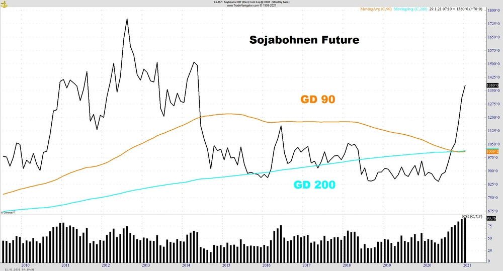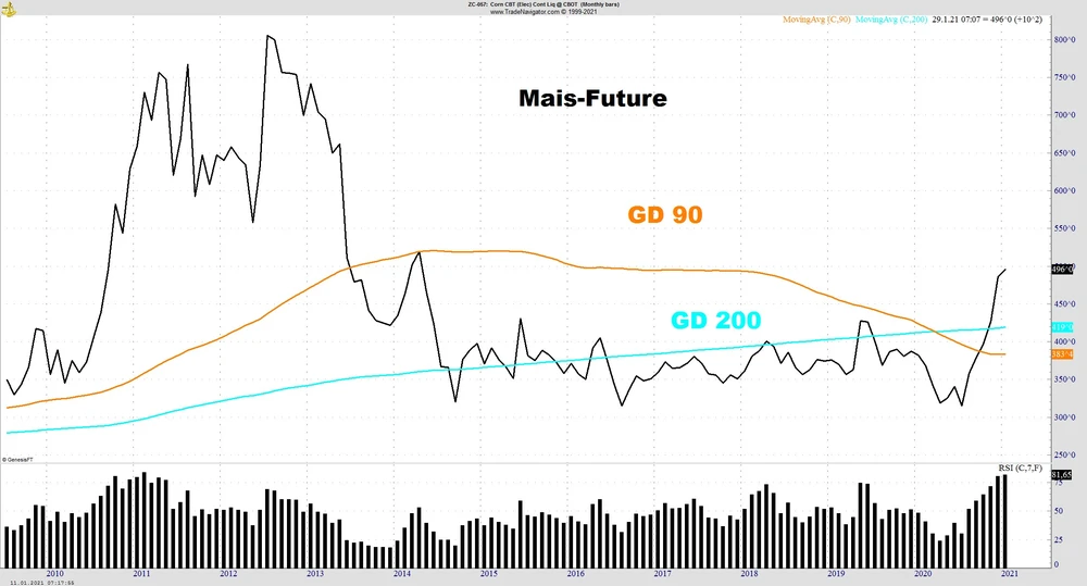 Spekulanten und Investoren haben das neue Jahr mit einer historischen Rekord Positionierung im amerikanischen Agrarsektor begonnen. Mit einer konsolidierten Long-Position von insgesamt +1.037.578 Kontrakten im Gesamtsektor konnten sowohl Mais, Sojabohnen und Weizen die höchsten Kurse seit 2014 erreichen. Das hat es seit Aufzeichnung der Daten, die wöchentlich im Commitments-of-Traders-Report (CoT) veröffentlicht werden, noch nie gegeben.