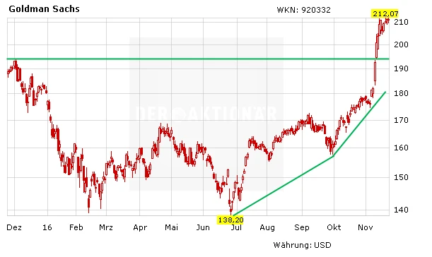 Die neuen Kapitalvorschriften dürften, wenn überhaupt, erst in ein paar Jahren in Kraft treten. Denkbar ist auch, dass man sich mit Trump einigt, der die Vorschriften für Banken generell abbauen will. Falls nicht, haben Aktionäre von Goldman Sachs & Co. auch nicht viel zu befürchten. Denn die amerikanischen Banken sind im Gegensatz zur europäischen Konkurrenz profitabel und solide aufgestellt. Goldman Sachs ist bei einem KGV von 12 und einem Kurs-Buchwert-Verhältnis von 1,1 aufgrund der Wachstumsaussichten für das Investmentbanking unter Trump günstig bewertet. Anleger geben kein Stück aus der Hand, das Ziel des AKTIONÄR beträgt 250,00 Euro. Bei 148,00 Euro wird der Stopp gesetzt.