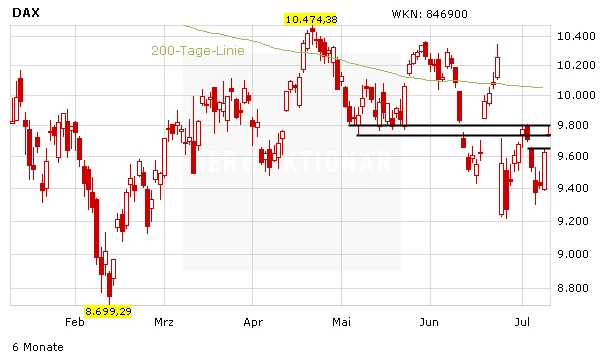 Aus technischer Sicht steht der DAX vor mehreren wichtigen Widerständen. Der erste liegt bei 9.800 Punkten und wurde am Montagmorgen schon einmal (erfolglos) angetestet. Der nächste findet sich bei 9.850 und resultiert aus dem Aufwärtsgap von Mitte Juni. Für langfristig orientierte Investoren ist freilich die 200-Tage-Linie ein entscheidendes Kriterium; die verläuft bei 10.052 Zählern.