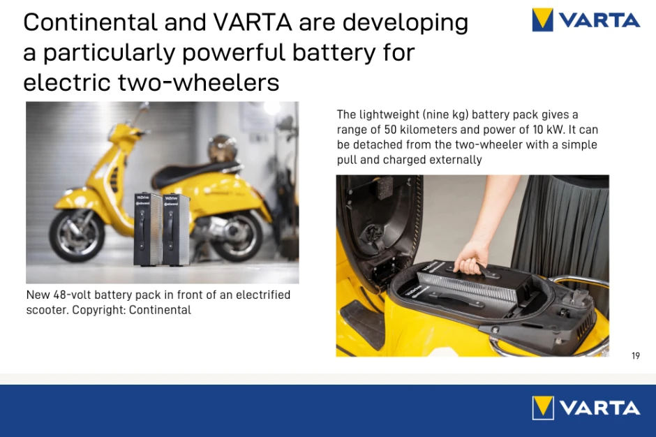Die Angebotspalette wird erweitert: In einem ersten Pilotprojekt haben Continental und Varta ein innovatives Produkt für den Zweiradmarkt entwickelt: ein austauschbares 48-Volt-Akku-Pack für elektrisch angetriebene Zweiräder ab 10 kW Antriebsleistung. Die Technologie schließt eine Lücke im stark wachsenden Markt für batterieelektrisch betriebene Fahrzeuge. Die Details gibt es hier.