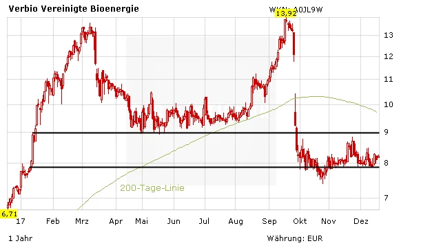 Gewinnt das Thema rund um die Biokraftstoffe in Deutschland wieder an Bedeutung, verfügt die Verbio-Aktie über hohes Aufwärtspotenzial. Zusätzliche Kursfantasie bietet ein möglicher Markteintritt in Indien. Die Verbio-Aktie braucht positive Impulse, um die mehrmonatige Schiebezone nach oben zu verlassen. Gelingt der Sprung über den horizontalen Widerstand im Bereich von 9 Euro, winken schnelle Anschlussgewinne bis in die Kursregion von 10 Euro. Mutige Anleger gehen eine spekulative Trading-Position ein und sichern diese mit einem Stoppkurs knapp unterhalb des Oktobertiefs von 7,40 Euro ab.