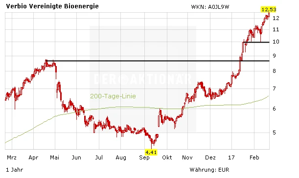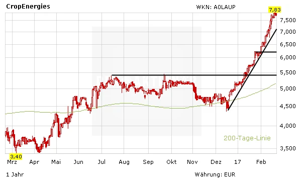 Doch seit den angepassten Umsatz- und Gewinnprognosen bei Verbio und CropEnergies legt der Preis unaufhaltsam zu. Selbst eine Konsolidierung beziehungsweise Korrektur auf das Preisniveau vom Januar dürfte in den kommenden Wochen weiter die Gewinne der beiden Bioenergie-Firmen sprudeln lassen.
