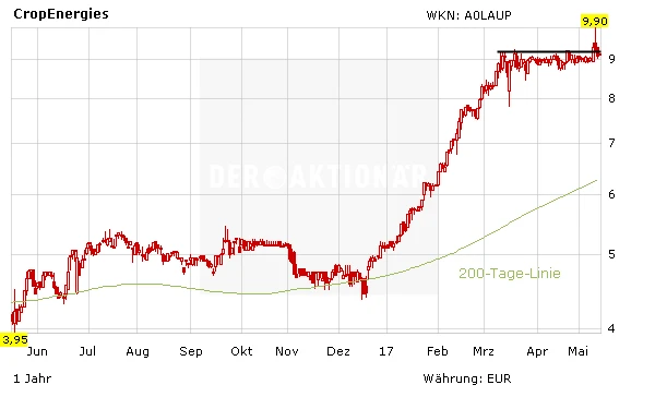 CropEnergies wird am Mittwoch die Bilanzpresse- und Analystenkonferenz für das Geschäftsjahr 2016/2017 abhalten. CEO Joachim Lutz könnte eine Überraschung in petto haben: Denn die Südzucker-Tochter ist enorm abhängig von den Ethanolpreisen. Diese zogen nach einer mehrwöchigen Konsolidierung wieder kräftig an. Im Zuge der Verbio-Zahlen konnte die CropEnergies-Aktie den Seitwärtstrend zumindest Intraday brechen und ein neues Allzeithoch bei 9,90 Euro markieren. Im Anschluss gab das Papier die Gewinn allerdings wieder ab.