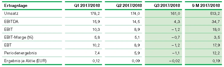 Verbio hat nach einem schwachen dritten Quartal des gebrochenen Geschäftsjahres 2017/2018 die Prognose (EBITDA von 50 Millionen Euro) zusammengestrichen. Der Biokraftstoffhersteller plant nun ein EBITDA von 40 Millionen Euro zu erzielen. Unter dem Strich steht sogar ein kleiner Verlust im dritten Quartal zu Buche.