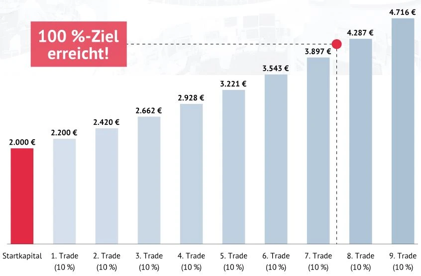 Konkret geht es darum, mit mehreren Investments mit einer Zielperformance von jeweils zehn bis 20 Prozent das Kapital zu verdoppeln. Es wird also nicht nach dem einen Top-Trade, sondern nach mehreren durchschnittlichen Trades gesucht. Die Wahrscheinlichkeit, mehrere 10-Prozent-Investments zu finden, ist höher, als einen 100-Prozenter auszumachen.