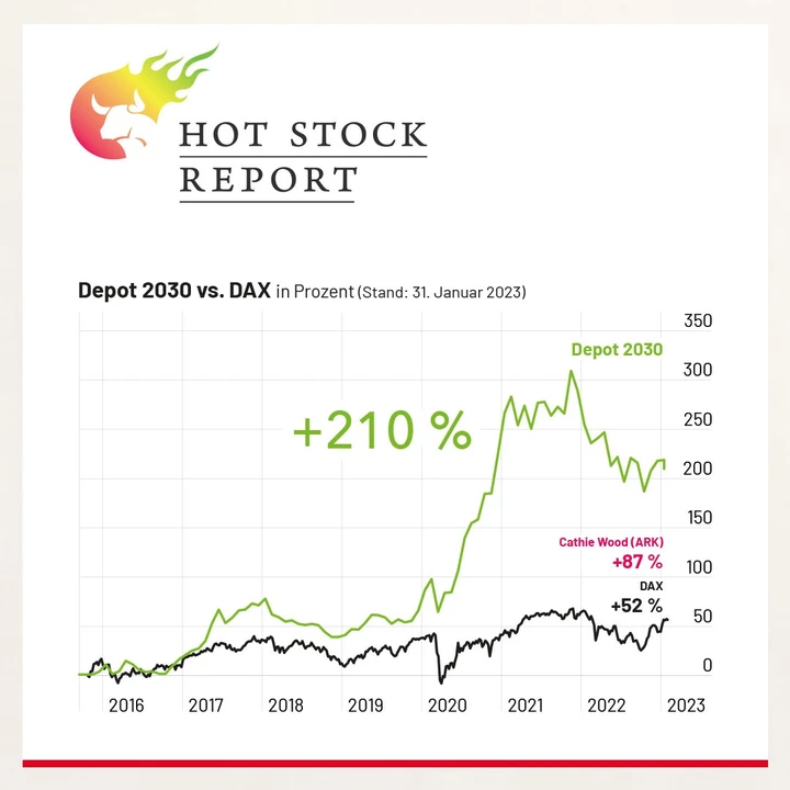 Die Strategie, mutig und frühzeitig auf neue Trends zu setzen, zahlt sich aus. Das Depot 2030 hat seit dem Start 2015 allen Krisen getrotzt und mit einem Plus von 217 Prozent im Vergleich zum DAX mehr als viermal so hohe Gewinne erzielt. Lust auf mehr? Dann investieren Sie gemeinsam mit Florian Söllner jetzt in die Megatrends der Zukunft.