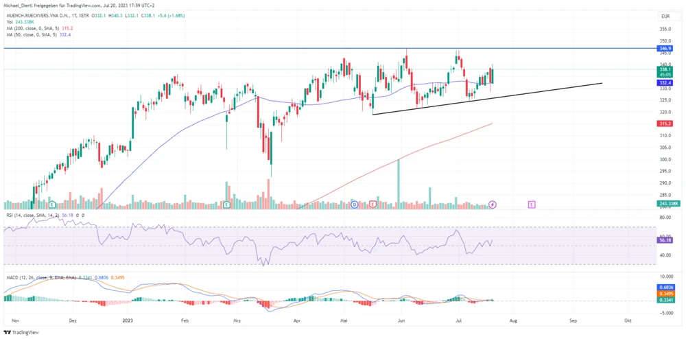 Munich Re scheint mit dem Kursplus am Donnerstag den nächsten Angriff auf das Allzeithoch bei 346,90 Euro zu starten. Zwar war die Aktie am Dienstag kurzzeitig unter den GD50 bei 332,40 Euro gefallen, allerdings konnten die Bären den Kurs nicht nachhaltig unter dieser Marke halten, was als bullish zu werten ist. Kann die Versicherungsaktie die Woche sogar über der psychologisch wichtigen 340-Euro-Marke abschließen, stehen die Chancen gut, dass sie bald ein neues Allzeithoch markiert.