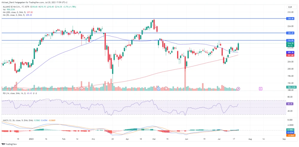 Von einem neuen Allzeithoch ist die Allianz-Aktie zwar noch mehr als 100 Euro entfernt. Doch zumindest ein neues Jahreshoch ist in greifbarer Nähe. Schaffen es die Bullen, den Kurs über das Juli-Hoch bei 216,05 Euro zu drücken, sollte das entstehende Kaufsignal den Weg bis zum Gap vom 4. Mai bei 220,20 Euro frei machen. Das dadurch entstehende Aufwärtsmomentum könnte den Kurs anschließend sogar über das Jahreshoch bei 228,40 Euro befördern.