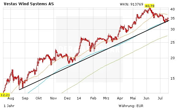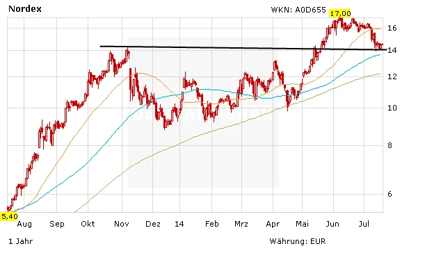 Dennoch: charttechnisch sieht die Aktie von Vestas derzeit besser aus als das Papier von Nordex. Sicher weist Vestas eine hohe Verschuldung auf, der Kurs ist weit vorausgeeilt, dennoch, so lange der Trend intakt ist, bleiben Anleger an Bord. Bei Nordex loht sich auf dem akteullen Niveau wieder der Einstieg. Das Niveau um 14,50 Euro wurde verteidigt, seit dem Hoch hat das Papier knapp 17 Prozent korrigiert.