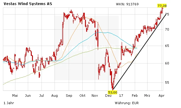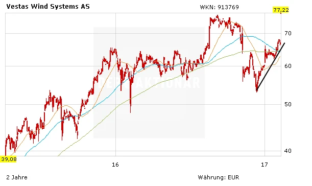 Die Aktie von Vestas bahnt sich kontinuierlich ihren Weg weiter nach oben. Kein Wunder, hat der Windanlagenbauer kürzlich gleich mehrere große Aufträge an Land gezogen: ein Großprojekt im US-Bundessaat Texas, für das Vestas 43 Windturbinenliefern liefern wird, sowie einen Offshore-Windpark in der Nordsee.