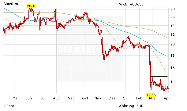 Die Aktie von Konkurrent Nordex versucht noch immer zwischen 13,00 und 14,50 Euro einen Boden auszubilden.