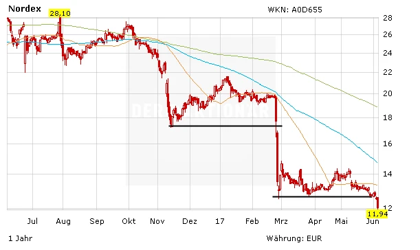 Nordex hingegen ist noch immer auf der Suche nach einem tragfähigen Boden. Die Aktie ist unter das letzte Tief von 27. Februar bei 12,41 euro gerutscht. Die nächste Unterstützung liegt bei 11,32 Euro aus dem Jahr 2013.