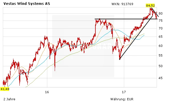 Vestas befindet sich nach wie vor in einem intakten Aufwärtstrend. Und das in dem aktuellen Branchenumfeld: beeindruckend! Wer investiert ist, bleibt dabei! Das nächste Etappenziel lautet 84,52 Euro. Wird das genommen, kann das Papier Richtung 90,00 Euro laufen.