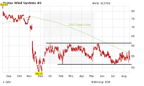 Gestern notierte die Vestas-Aktie zeitweise bei 431 Kronen, am Donnerstag rutschte der Kurs wieder auf 399 Kronen zurück. Bei 423 Kronen verläuft die 200-Tage-Linie. Bei der deutschen Notierung sieht es ähnlich aus: Der kurze Ausbruch über die 200-Tage-Linie konnte nicht bestätigt werden. Die Aktie läuft seit Jahresanfang in einem breiten Seitwärtskanal. Erst über 61,50 Euro sähe es technisch wieder besser aus. Solange bleiben Anleger - wie auch bei Nordex - beobachtend an der Seitenlinie.