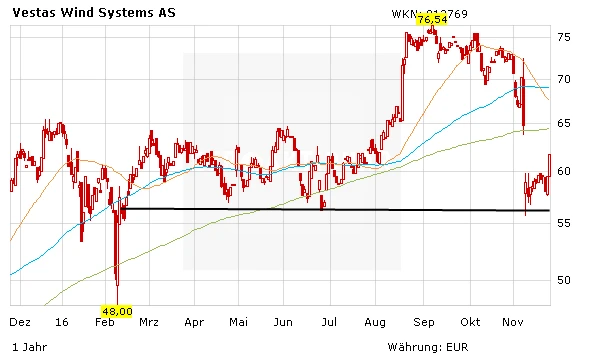 Gleiches gilt für Vestas. Das Papier sieht nach dem starken Rücksetzer wieder gut aus. Gerüchten zu Folge ist der dänischen Marktführer für Windenergieanlagen an der Übernahme eines chinesischen Konkurrenten interessiert. Bei Kursen zwischen 57,50 Euro und 60,00 Euro sollte der Boden erreicht sein. Der Stopp für Vestas lautet 53,50 Euro.