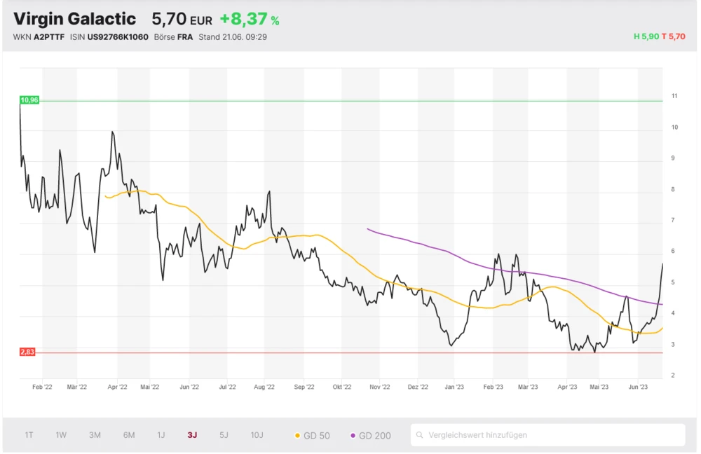 Laut Precedence Research wird sich der Weltraumtourismus bis 2032 nahezu vervierfachen. Von den drei Anbietern SpaceX und Blue Origin dürfte Virgin die besten Karten haben. Obwohl das Unternehmen mit knapp 900 Millionen Dollar über genügend Cash verfügt, dürfen die sehr hohen Betriebskosten nicht außer Acht gelassen werden. Bei ungefähr 6 Euro ist ein charttechnischer Wiederstand, von hier aus sollte die hochspekulative Aktie in eine Konsolidierung übergehen.