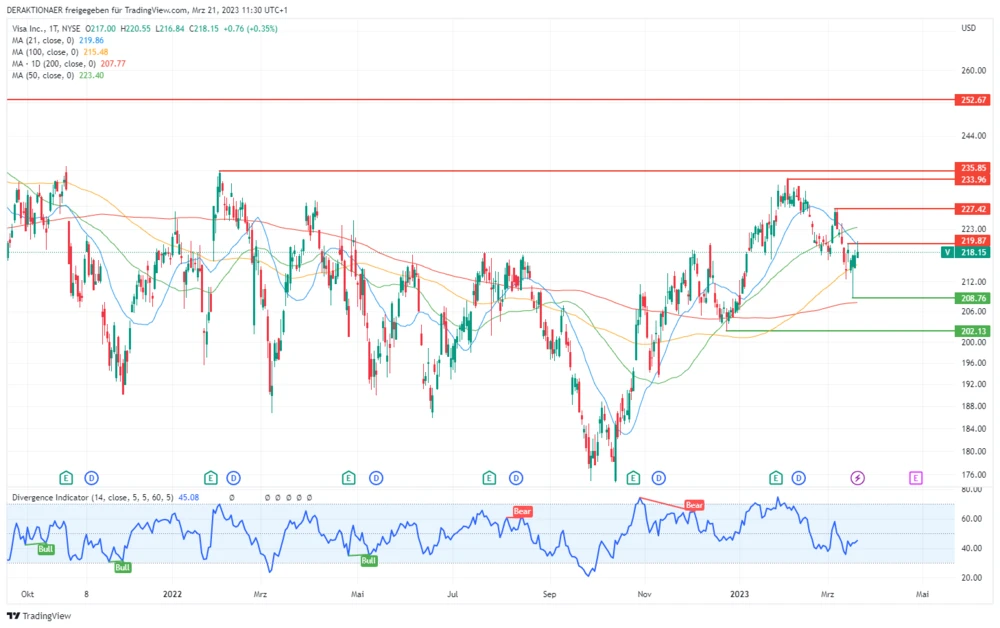Anfang Februar erreichte die Visa-Aktie noch ein Mehrmonatshoch bei 233,96 Dollar. Der höchste Stand seit zwölf Monaten. Im Anschluss setzten Gewinnmitnahmen ein und die Zinserhöhungen schlugen Anlegern immer mehr auf den Magen. Der Titel sackte um bis zu 10,8 Prozent ab und markierte ein neues Mehrmonatstief bei 208,76 Dollar.