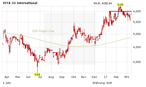 Fundamental bleibt Vita 34 klar auf Kurs. Langfristig dürfte sich der Expansionskurs noch stärker im Ergebnis bemerkbar machen. Zwar sind die Papiere mit einem KGV von 40 für 2017 kein Schnäppchen. Doch die Aktie notiert immer noch deutlich unter dem Buchwert von aktuell 7,74 Euro und wartet mit einer ordentlichen Dividendenrendite von rund 2,8 Prozent auf. Investierte Anleger bleiben dabei. Risikobewusste Neueinsteiger sollten den Sprung über den Widerstand im Bereich von sechs Euro abwarten.