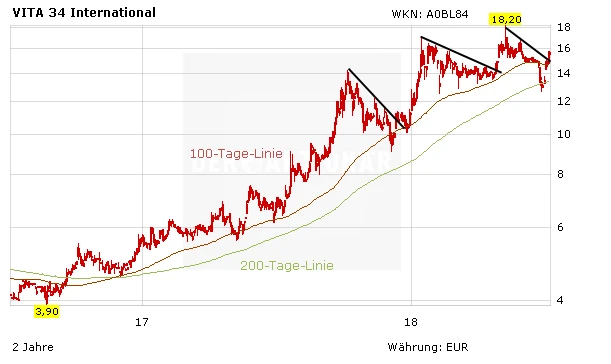 In der Schwächephase hat Montega-Analyst Henrik Markmann die Vita-34-Aktie von "Halten" auf "Kaufen" nach oben gestuft und das Kursziel leicht von 15 auf 16 Euro angehoben. Vita 34 erschließe weitere Wachstumspotenziale. Den Ergebnisbeitrag aus der Umsetzung der Kostensenkungsmaßnahmen in Skandinavien ab 2019 habe Markmann in den kurz- und mittelfristigen Prognosen berücksichtigt. Beim Kursverlauf handele es sich um einen ungerechtfertigten Kursrücksetzer.