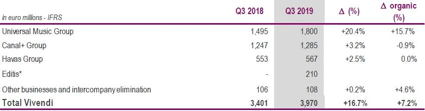 Vivendi steigerte seinen Umsatz im dritten Quartal überraschend kräftig. Bereinigt um Währungseffekte sowie den Kauf und Verkauf von Unternehmensteilen legten die Erlöse im Vergleich zum Vorjahreszeitraum um gut sieben Prozent auf 3,97 Milliarden Euro zu. Das mehr als von Analysten im Schnitt erwartet.