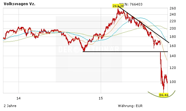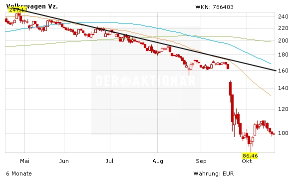 Noch am Montag hat Max Warburton von Bernstein Research einen anderen Weg eingeschlagen. Der Analyst hat zwar das Kursziel für die VW-Aktie von 200 auf 160 Euro gesenkt, die Einstufung aber auf "Outperform" belassen. Die Befürchtungen des Marktes über die finanziellen Folgen der Abgasaffäre seien übertrieben, schrieb Warburton. Die Fahrzeugnachfrage in Europa und China sowie die langfristige Ertragskraft von VW würden dadurch keinen nachhaltigen Rückschlag erleiden. Er rechnet mit Gesamtkosten von 15 bis 20 Milliarden Euro.