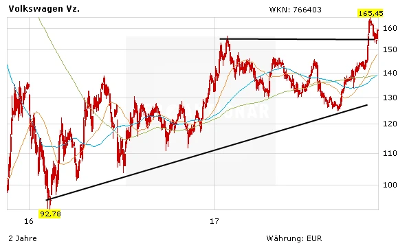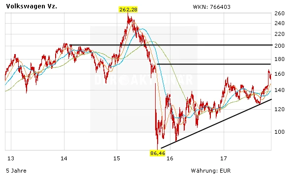 Fakt ist: VW hat sich klar zum Thema E-Auto bekannt, steckt 20 Milliarden Euro in neue Stromer, 50 Milliarden Euro in Batterien. Die Anleger haben das klare Bekenntnis zur Elektromobilität honoriert. Nachdem die VW-Aktie das Break über den Abwärtstrendkanal bei 146,55 Euro geschafft hatte, schaltete das Papier einen Gang nach oben. Innerhalb von nur wenigen Tagen ging es bis auf knapp 165,45 Euro.
