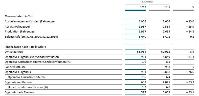 VW gab am Mittwochmorgen die detaillierten Zahlen für das erste Quartal bekannt. Der Gewinn vor Steuern ging im Vergleich zu den ersten drei Monaten des Vorjahres von 4,1 Milliarden auf noch 0,7 Milliarden Euro zurück. Der Umsatz sank zwischen Januar und März von 60,0 auf 55,1 Milliarden Euro. Die Auslieferungen aller Marken gingen um fast ein Viertel (23 Prozent) auf rund 2 Millionen Fahrzeuge zurück.