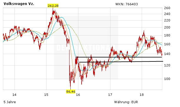 Die Aktien liefern derzeit jedenfalls wenige Kaufargumente. Es gibt die eine oder andere Kaufstudie, jedoch kommen die Aktien einfach nicht vom Fleck. Was das Papier von VW betrifft, so ist die Aktie zuletzt mehrmals an der 38-Tage-Linie gescheitert. Die nächste Unterstützung liegt bei 136,75 Euro. Hier lagen die Hochpunkte aus dem Dezember 2015 und Mai 2016. Fällt diese Marke, kann das Papier bis auf 125,70 Euro durchgereicht werden. Hier liegt eine starke Unterstützungslinie.