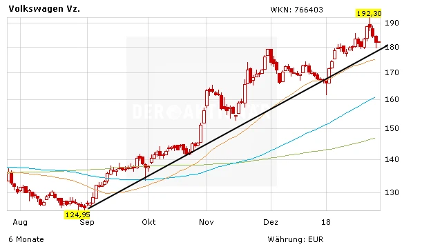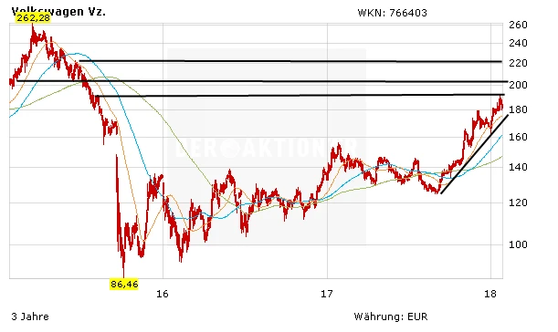 Am Mittwoch hat Patrick Hummel von der UBS ein Kursziel von 210 Euro in Aussicht gestellt. Kein Wunder, dass viele Analysten optimistisch für die VW-Aktie sind. Darunter Kepler Cheuvreux. Der Autokonzern dürfte in puncto Profitabilität und Liquidität 2018 weiter zulegen, schrieb Analyst Michael Raab in einer am Dienstag vorliegenden Studie. Aber auch mögliche Anteilsverkäufe könnten sich wertsteigernd auswirken Sein Kursziel lautet 220 Euro.