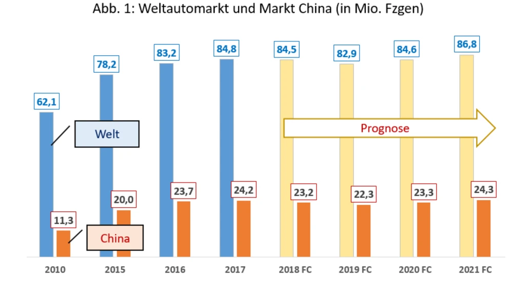 China ist mit 23 Millionen neu verkauften Autos der wichtigste Absatzmarkt der Welt. Zum Vergleich: In den USA werden pro Jahr 17 Millionen neue Autos verkauft. In Deutschland sind es knapp 3 Millionen Neuwagen.