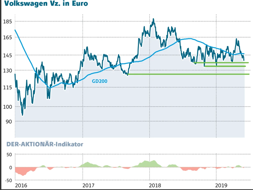 Die Aktie von VW ist zuletzt aufgrund des Handelskriegs zwischen den USA und China sowie den schwachen Daten aus dem Reich der Mitte unter Druck geraten. Die wichtige 200-Tage-Linie hat nicht gehalten. Die nächste starke Unterstützungszone liegt jetzt zwischen Euro und 138,10 Euro und 139,50 Euro. Anleger können versuchen mit einem Abstauberlimit bei 138,50 Euro ein paar Stücke einzusammeln. Ein positives technisches Signal hingegen würde sich erst bei Rückeroberung der 200-Tage-Linie (146,50 Euro) ergeben.