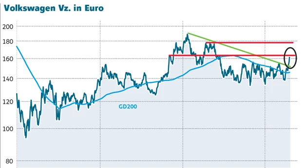 Nach dem starken Anstieg ist eine Konsolidierung allerdings überfällig. Schon am Dienstag setzten Gewinnmitnahmen ein. Diese könnten die VW-Aktie im Idealfall bis auf das Ausbruchsniveau bei 156,00 Euro führen. Anschließend sollte die Aktie wieder fahrt aufnehmen. Nach dem Break der Marke von 165,00 Euro hätte die Aktie Luft bis 178,00 Euro.