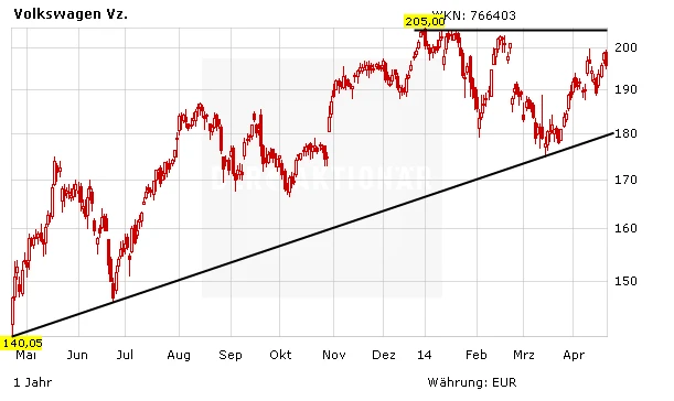 Fundamental sieht es nach wie vor gut aus bei Volkswagen. Auch wenn Toyota insgesamt mehr Autos verkauft, laufen die Geschäfte für die Wolfsburger gut. Die Charttechnik sieht gut aus. In den kommenden Tagen könnte die VW-Aktie den alten Widerstand bei 205 Euro nach oben überwinden. Dann winkt neues Kurspotenzial. Dabei bleiben!