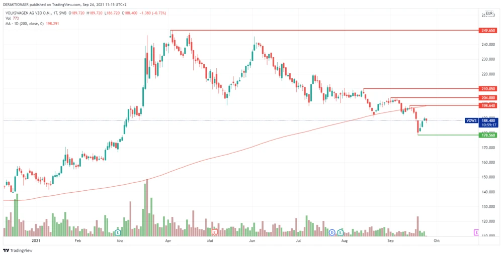 Tatsächlich hat die Aktie von VW nach dem Jahreshoch im April bei knapp 250 Euro kontinuierlich den Rückwärtsgang eingelegt. Aktuell notiert der Titel bei 188 Euro und damit 25 Prozent tiefer. Am turbulenten Montag in dieser Woche sackte der Kurs auf ein Jahrestief bei 178,56 Euro ab. Im Wochenverlauf setzte eine Erholung ein und die Papiere legten um rund fünf Prozent zu.