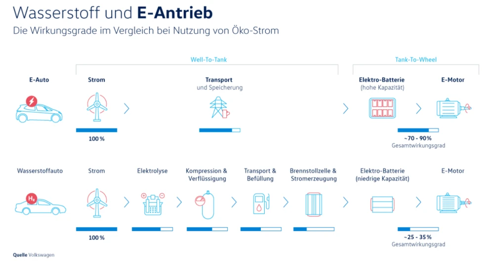Laut der Studie "Automobilindustrie 2035 – Prognosen zur Zukunft", der Unternehmensberatung Horváth & Partners gingen bei einem batteriebetriebenen E-Auto nur acht Prozent der Energie beim Transport verloren, bevor der Strom in den Akkus der Fahrzeuge gespeichert wird. Bei der anschließenden Umwandlung der elektrischen Energie zum Antrieb des E-Motors gingen dann nochmals 18 Prozent verloren. Insgesamt kommt das batteriebetriebene E-Auto dadurch je nach Modell auf einen Wirkungsgrad von 70 bis 80 Prozent.