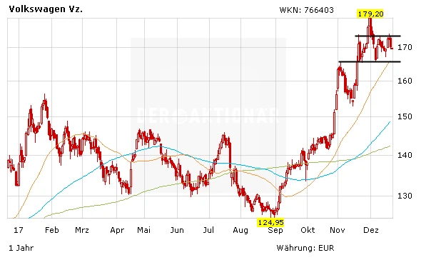 Die VW-Aktie konsolidiert derzeit in einer Range zwischen 168 Euro und 175 Euro. Anleger warten auf einen Ausbruch über den hartnäckigen Widerstand bei 175 Euro. Wird dieser in einem freundlichen Gesamtmarkt überwunden, sind durchaus 220 Euro plus X möglich. VW drückt in Sachen E-Mobilität und neue Mobilitätskonzepte ordentlich auf die Tube. Anleger werden dieses klare Bekenntnis auch in den nächsten Wochen mit Kursgewinnen belohnen.