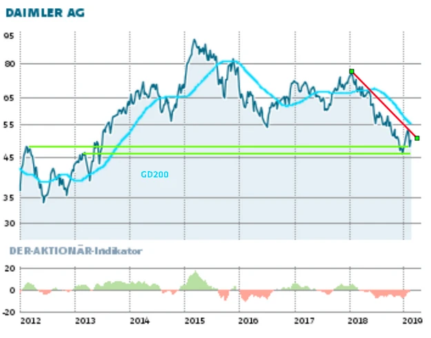 Die BMW-Aktie zeigt nach wie vor keinen klaren Trend. Erst wenn die Aktie denn Abwärtstrend bei 75,60 Euro überwindet, ist die Aktie wieder einen Blick wert. Ähnlich die Situation bei Daimler. Es sieht ganz danach aus, als würde die Aktie wieder in den Bereich zwischen 48,50 Euro und 50,00 Euro zurückfallen.