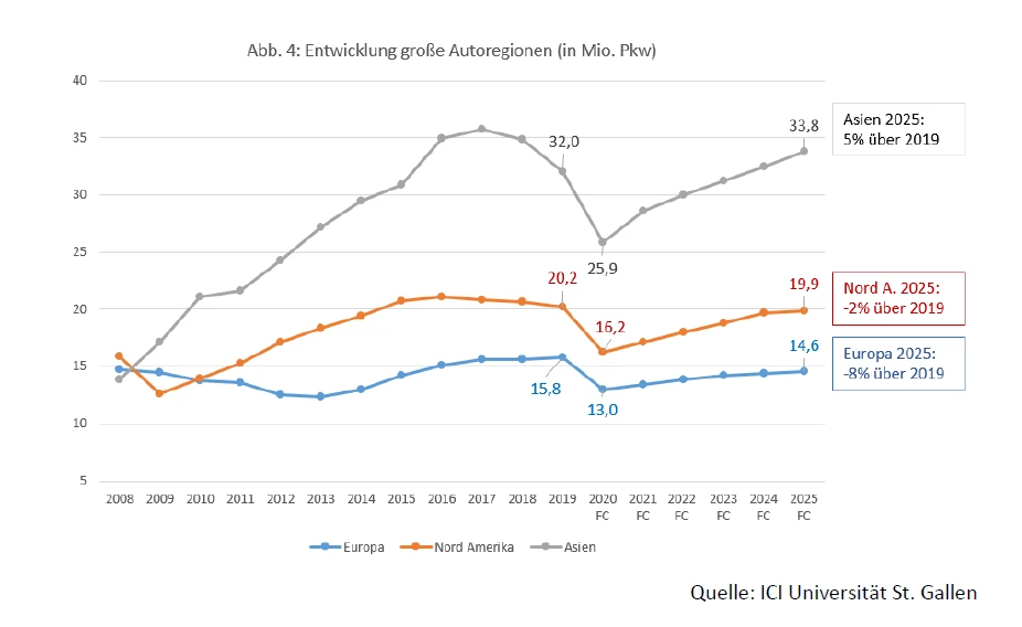 Auto-Experte Ferdinand Dudenhöffer geht davon aus, dass es einige Jahre dauern wird, bis das Vorkrisen-Niveau wieder erreicht werden kann. „Weltweit wird man es schaffen durch die zu erwartende Erholungsgeschwindigkeit in China im Jahr 2025 wieder die Verkaufs-Niveaus wie vor der Krise im Welt-Pkw-Geschäft zu erreichen“, sagt Dudenhöffer.