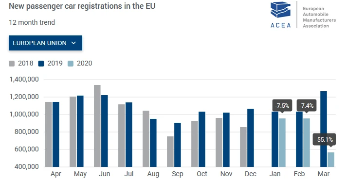 In Italien wurden im Monat Märk 85,4 Prozent weniger Autos verkauft als im Vorjahreszeitraum. In Frankreich ging es um 72,2 Prozent und in Spanien um 69,3 Prozent nach unten. Deutschland verzeichnete ein Minus von 37,7 Prozent, wie der europäische Branchenverband Acea am Freitag in Brüssel mitteilte.