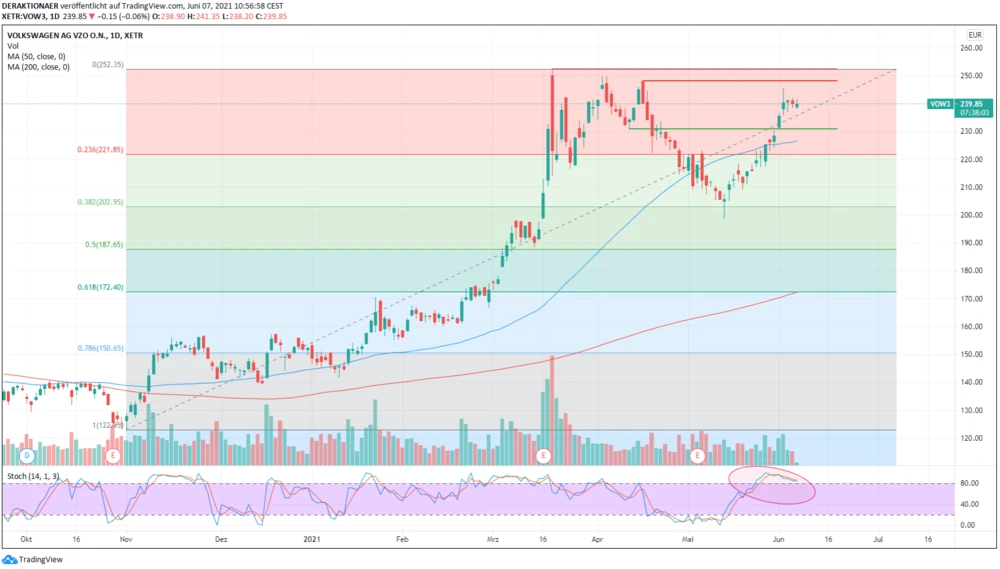 Ausgehend vom Korrektur-Tief am 13. Mai bei 198,90 Euro hat die Volkswagen-Aktie eine starke Erholungsbewegung hingelegt. Nachdem der Wert Ende Mai die Widerstände am 23,6%-Fibonacci-Retracement bei 221,85 Euro und an der 50-Tage-Linie bei 224,32 Euro überschritten hatte, beschleunigte sich der Anstieg noch weiter.