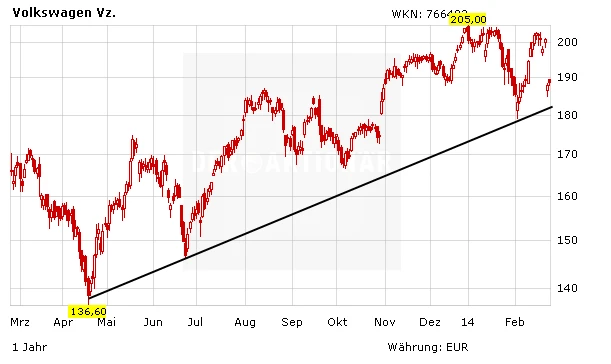 Die Volkswagen-Aktie geriet am Anfang der Handelswoche unter dir Räder. Grund war der Ausblick für das laufende Geschäftsjahr. Das Geschäftsjahr 2013 schlossen die Wolfsburger mit leichten Zuwächsen bei Umsatz und operativen Gewinn ab.