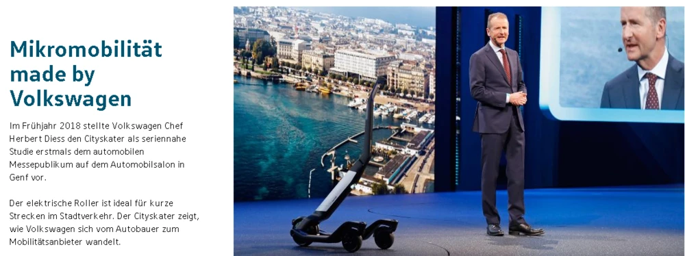 Bereits auf dem Autosalon in Genf 2018 stellte VW-Chef Herbert Diess den so genannte „Cityskater“ vor. Damals sagt Diess, konkrete Projekte zur Mikromobilität seinen in Arbeit, es gebe derzeit aber noch keine endgültige Entscheidung.