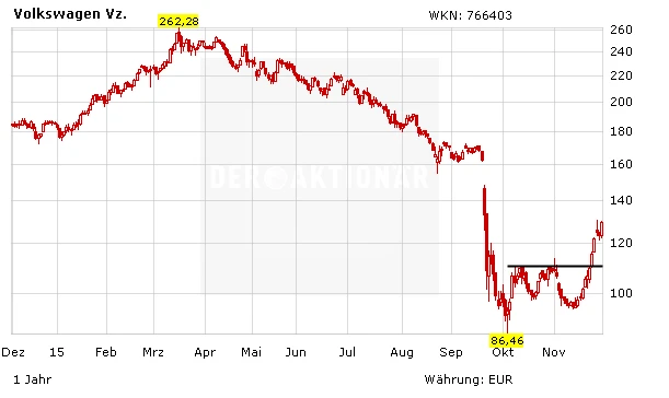 Die VW-Aktie erholt sich zusehends vom Abgasskandal, dessen Bekanntwerden vor rund zehn Wochen einen kolossalen Kursrutsch ausgelöst hatte. Nachdem der kurzfristige Seitwärtstrend nach oben durchbrochen wurde, kratzt das Papier mittlerweile wieder an der 130-Euro-Marke.