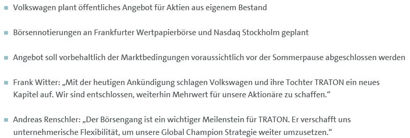 Derweil gibt es News zum Börsengang der Lkw-Sparte Traton. Der Volkswagen -Konzern hält trotz der herrschenden Unsicherheit an den Finanzmärkten am Börsengang seiner Lkw-Sparte fest. Es werde eine Notierung in Frankfurt und in Stockholm vorbereitet, teilte das Unternehmen am Montagabend in Wolfsburg und München mit. Der Börsengang solle vorbehaltlich der Marktbedingungen voraussichtlich vor der Sommerpause abgeschlossen sein. Die Aktien kommen demnach aus dem Bestand von Volkswagen, es soll keine Kapitalerhöhung geben. Der Konzern will auch nach dem Börsengang die Mehrheit an Traton halten.