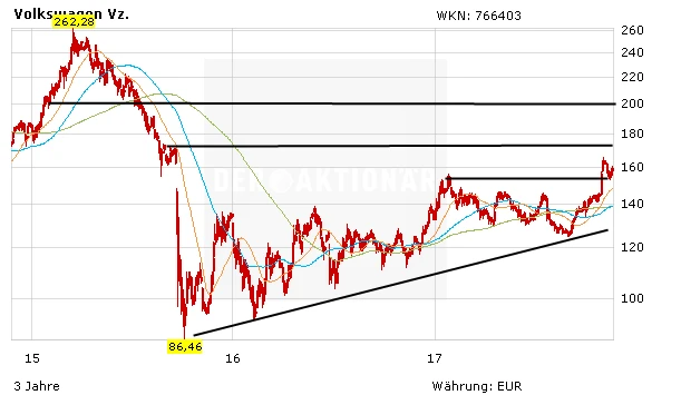 Die Anleger honorieren das klare Bekenntnis zur Elektromobilität. Nach dem Anstieg von 126 Euro auf knapp 163 Euro konsolidierte das Papier bis 155 Euro. Nach der kurzen Verschnaufpause hat das Papier durchaus Luft bis 175 Euro. Hier wartet ein starker Widerstand aus dem Monat Dezember 2014 und September 2015. Wird dieser überwunden, sind in einem freundlichen Gesamtmarkt durchaus Kurse um 200 Euro drin. Stärkere Rücksetzer in Folge eines verunsicherten Marktumfeldes nach dem Platzen der Koalitionsverhandlungen könnten den Anlegern gute Einstiegskurse ermöglichen. Die Aktie bleibt aussichtsreich.